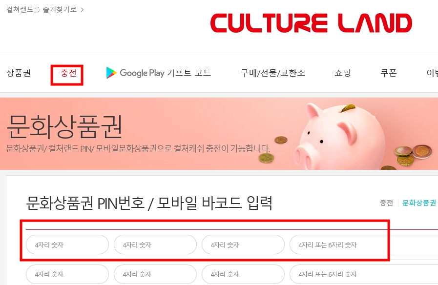 cultureland.co.kr로 이동후 충전 메뉴로 이동하면 문화상품권 PIN번호 및 모바일 바코드 번호를 입력할 수 있다.