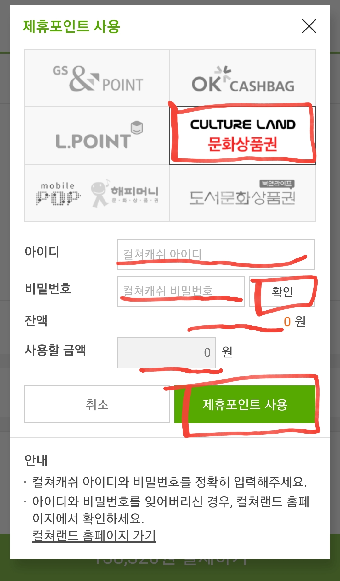 CULTURE LAND 문화상품권을 선택하고 컬처랜드의 아이디와 비밀번호를 입력한 후 사용금액을 정한다.