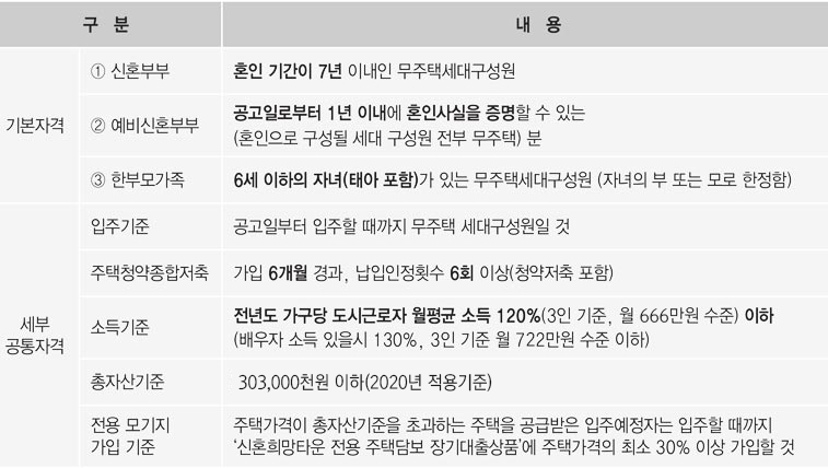 신청대상은 혼인기간 7년이내 또는 3개월 내 결혼예정자와 부부합선 연소득 6천만원, 순자산 2억8천8백만원 이하 무주택 세대주이다.