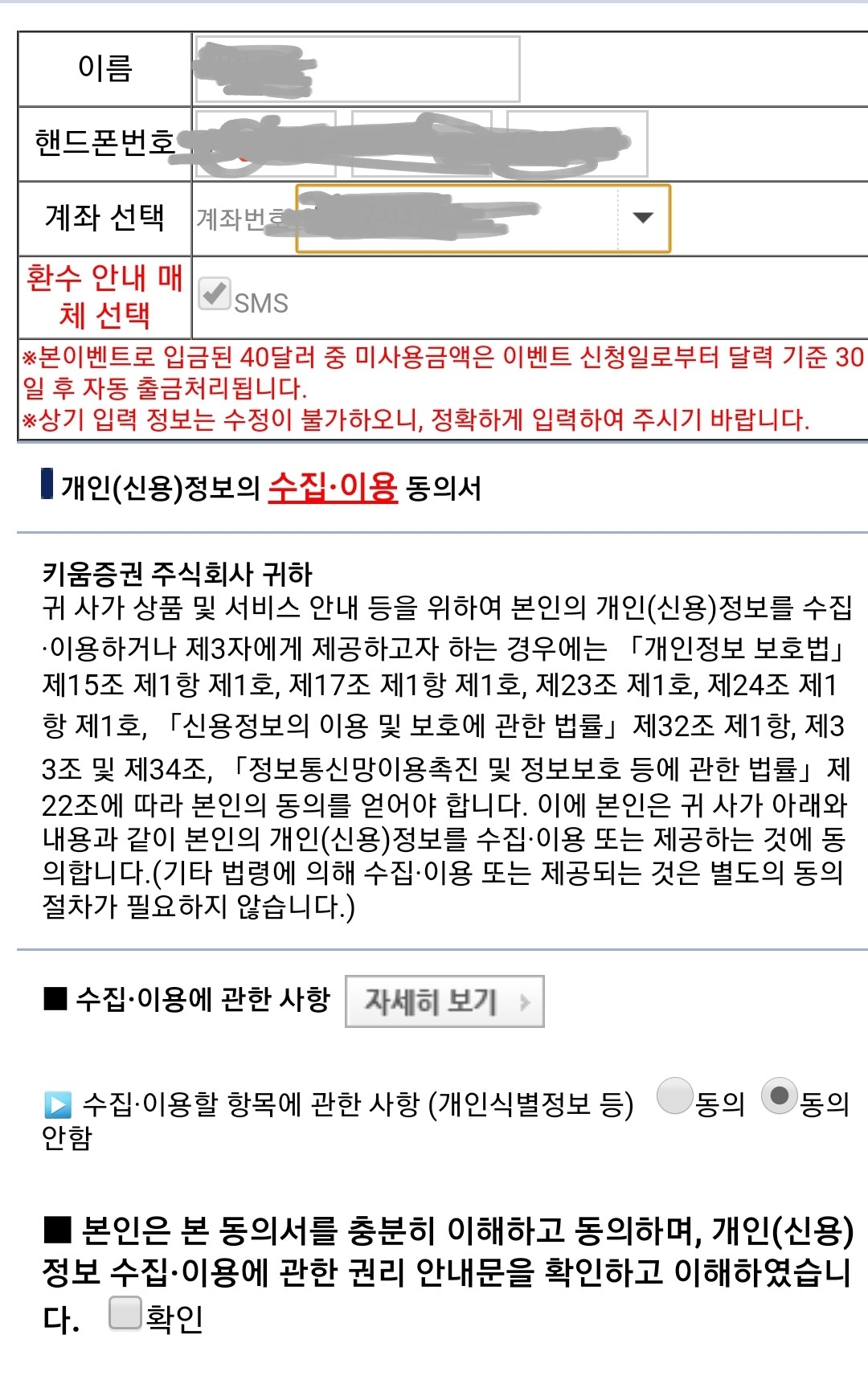 영웅문S에 로그인해 있는 상태에서 40달러 이벤트신청을 하므로 이름, 핸드펀번호, 영웅문S글로벌에서 만든 해외주식계좌가 자동으로 세팅되어 나오고 편리하게 신청할수 있도록 되어있다.