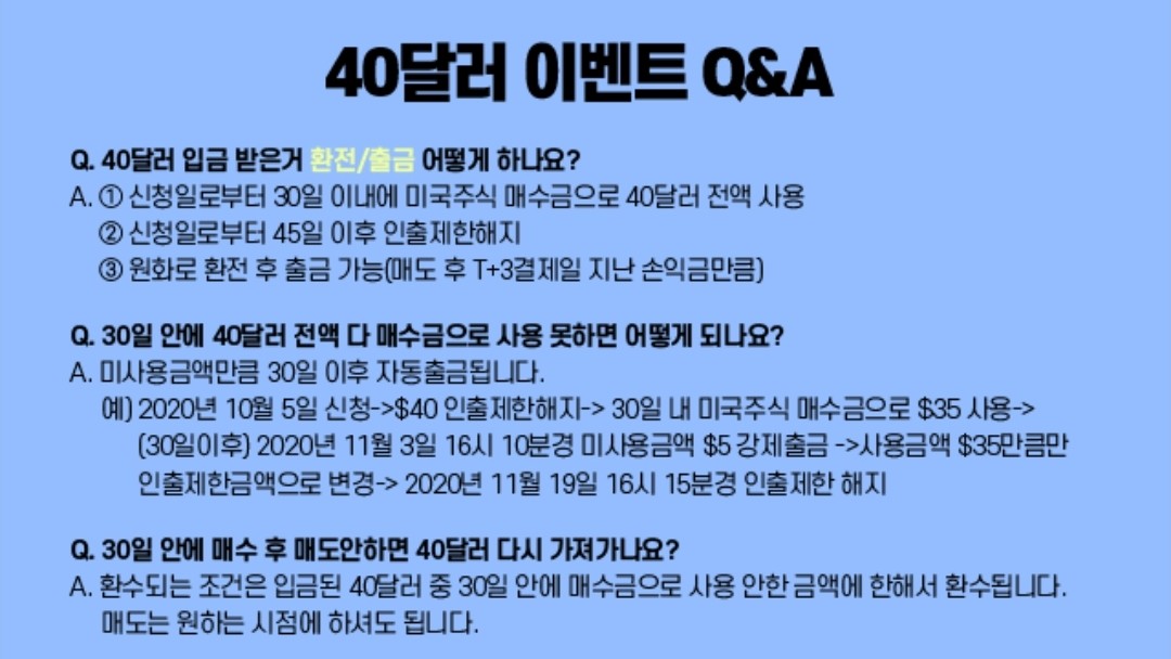 40달러를 받으면 신청일로부터 한달이내 미국주식 매수금으로 사용해야하고 사용하지 않으면 자동으로 빼간다는 내용이다. 즉 한달안에 무조건 미국주식을 사야한다.