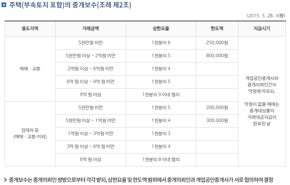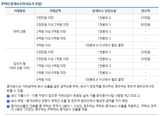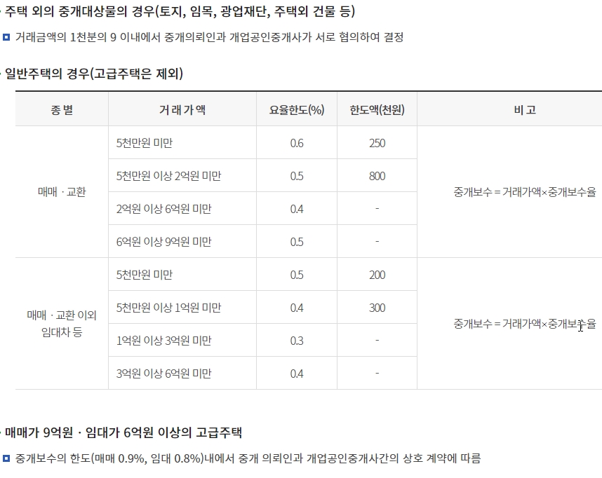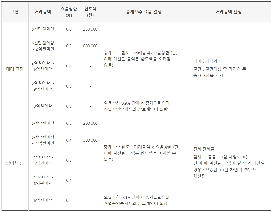 다음은 부동산 중개수수료 요율표이다. 전국 지역에 따라 요율은 다르다.