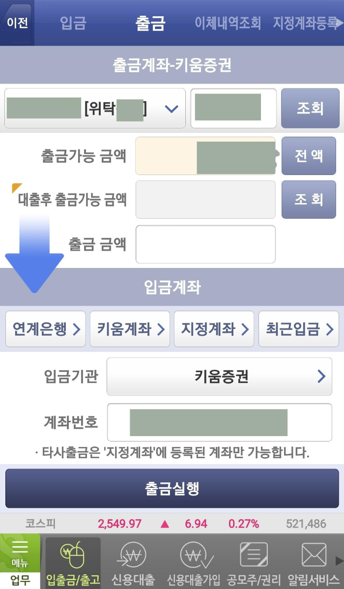 이런경우 영웅문S 앱으로 접속하여 업무메뉴의 출금 메뉴를 이용하여 무료 이체가 가능하다.