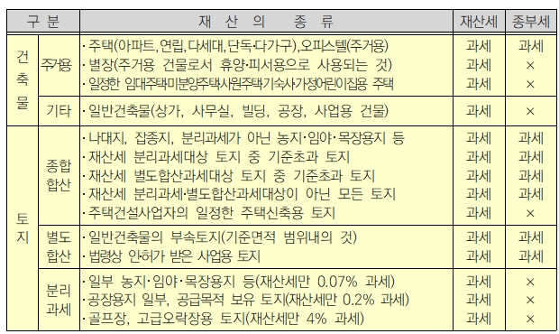 다음은 재산의 종류에 따른 재산세와 중부세 과세 대상의 구분이다.