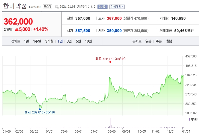 한미약품의 1년간 주가 추이이다.