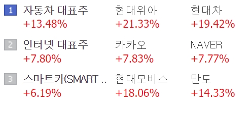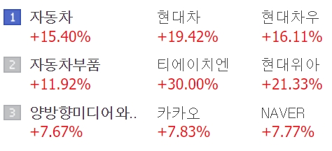 반도체, 자동차, 배터리 화학업체를 중심으로 친환경, 조선, 철강도 대형주 위주로 주가가 오르고 있다.