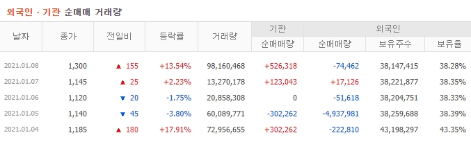 외국인과 외인의 거래현황이다.