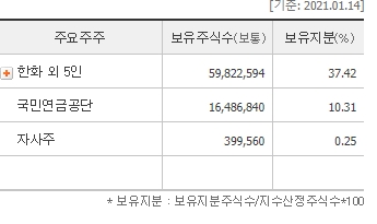 한화가 37프로, 국민연금공단이 10프로 지분을 가지고 있다.