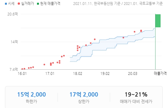 82제곱미터 평형으로 5년간 지속적인 상승세를 보이며 82제곱미터가 15억에서 17억대 매매가가 거래되고있다.
