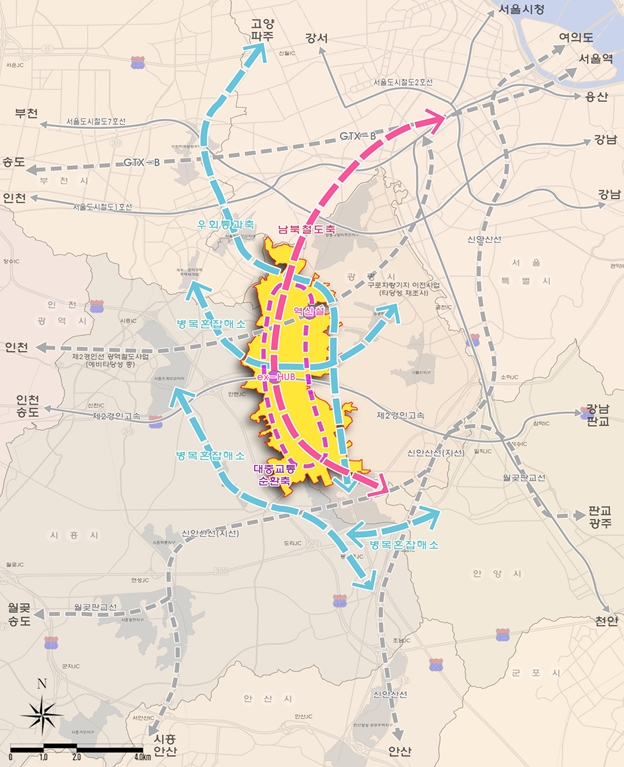 1호선, 2호선, 7호선과 신안산선, GTX B, 제2경인선을 연결하는 철도교통망을 구축한다.