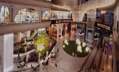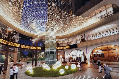 판테온스퀘어는 하늘에 초대형 예술작품들을 전시하고 바닥 조명을 활용하여 2층 브릿지 오로라 웨이를 구성한다.