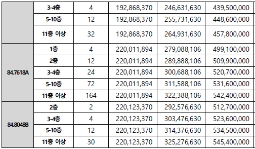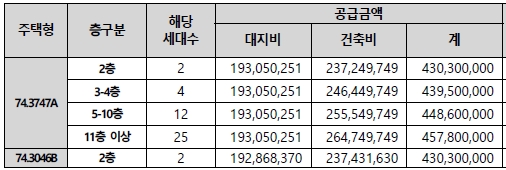 분양가는 74제곱미터형은 4억3천만원대에서 4억5천만원대를 형성하고 84제곱미터형은 4억9천만원대에서 5억4천만원대이다.