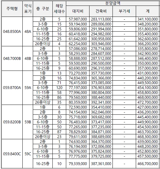 전용 48제곱미터형은 3억4천에서 3억6천만원대, 전용 59제곱미터형은 4억3천만원대에서 4억8천만원대,
