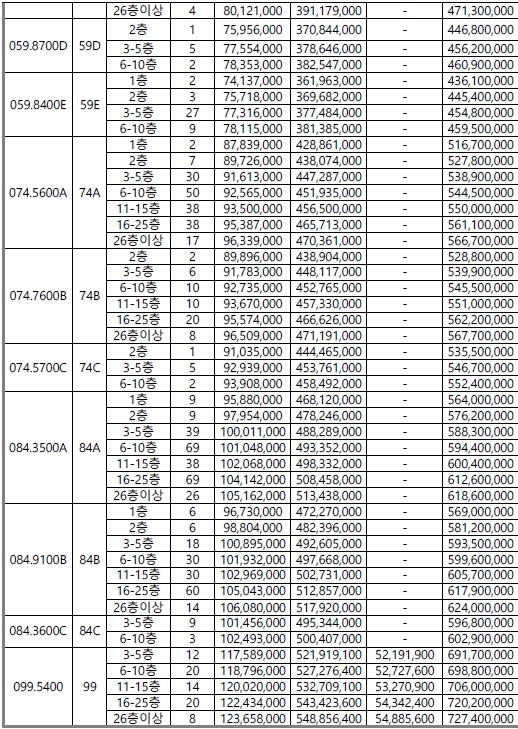 전용 74제곱미터형은 5억1천만원대부터 5억6천만원대이다.