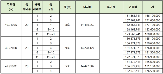 전용 49제곱미터 1억5천만원대부터 전용128제곱미터 5억5천만원대까지 다양한 평형의 분양가를 보이고 있다.
