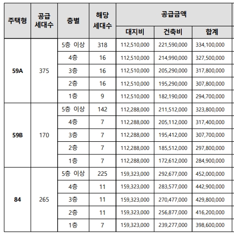 공급금액은 59형 최고가 기준 3억4천200만원, 84기준 4억6천260만원이다.