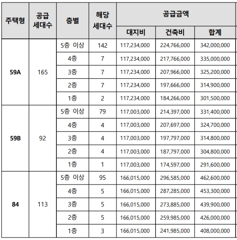 공급금액은 59형 최고 분양가기준 3억3천410만원이며 84형은 4억5천200만원이다.