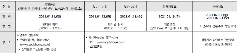 - 경쟁이 있는 경우 해당주택건설지역인 강릉시 거주자가 우선하며, 경쟁이 있는 경우 추첨으로 결정됩니다.