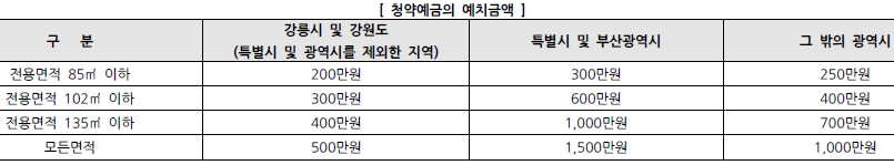 ① 청약예금 : 해당 주택에 신청 가능한 청약예금에 가입하여 6개월이 경과하고, 청약예금 지역별, 면적별 예치금액 이상인 1순위자