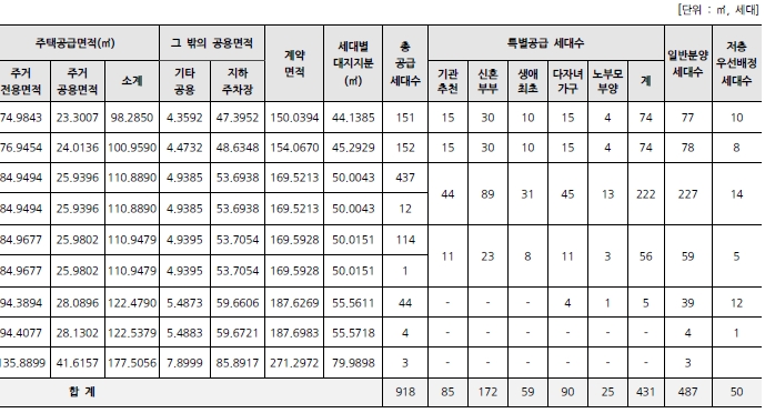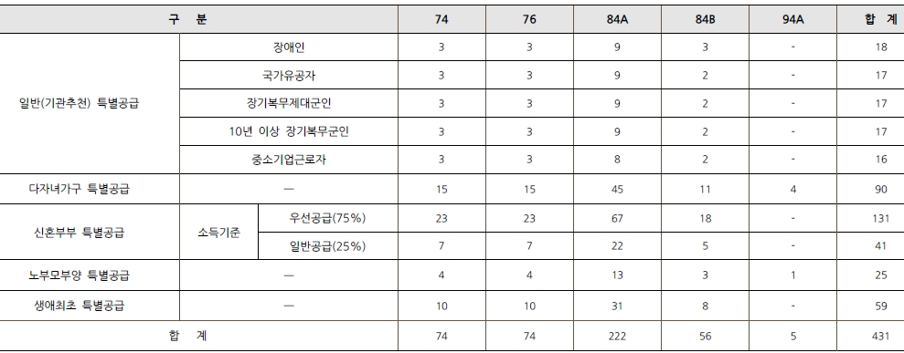 [특별공급 431세대(기관추천특별공급 85세대, 신혼부부특별공급 172세대, 생애최초특별공급 59세대, 다자녀가구특별공급 90세대, 노부모부양 특별공급 25세대)포함] 및 부대복리시설]