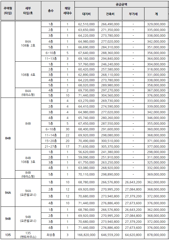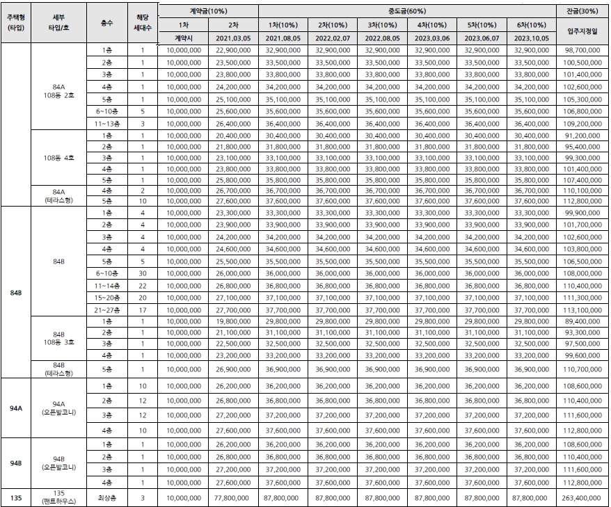 중대형 평수인 84~135제곱미터 분양가이다.