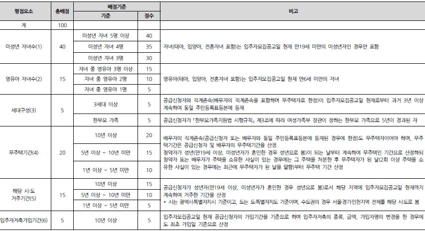 - 1순위에서 경쟁이 있는 경우 가점제 적용은 신청자 본인이 작성한 ‘청약가점 산정기준(「주택공급에 관한 규칙」별표1)’에 의거한 청약가점 점수를 우선순위로 당첨자를 선정합니다.