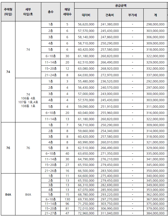 •84A타입과 84B타입은 일부 테라스 세대를 포함하고 있으며 별도 청약신청이 불가하오니 아래의 공급금액을 필히 확인하시어 주택형에 대한 혼돈 방지에 특히 유의하시기 바랍니다.