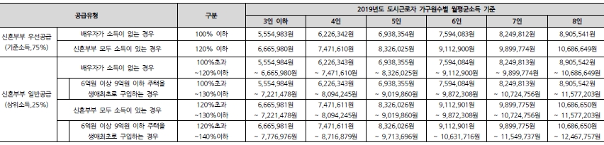 - 2018.05.04. 개정된 「주택공급에 관한 규칙」에 의거 민영주택 신혼부부 특별공급 대상 세대수의 75%를 전년도 도시근로자 가구원수별 월평균 소득 기준의 100%이하인 자(신혼부부 모두 소득이 있는 경우 120% 이하)에게 우선공급하며, 나머지 주택 25%(우선공급에서 미분양된 주택을 포함함)는 소득기준을 완화하여 전년도 도시근로자 가구원수별 월평균 소득 기준의 120%이하인 자(신혼부부 모두 소득이 있는 경우 130% 이하)까지 확대하여 일반공급(우선공급에서 입주자로 선정되지 아니한 자를 포함한다)합니다.