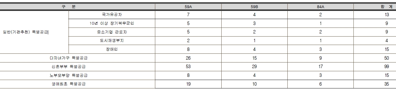 [특별공급 249세대(일반[기관추천] 50세대, 다자녀가구 50세대, 신혼부부 99세대, 노부모부양 15세대, 생애최초 35세대 포함) / 일반공급 250세대] 및 부대복리시설