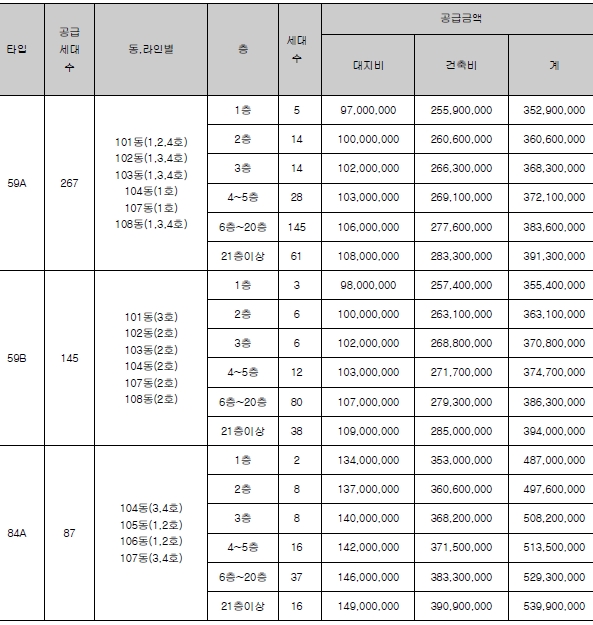 주택형별 일반분양 가구 수는 59㎡A 267가구, 59㎡B 145가구, 84㎡A 87가구이다.