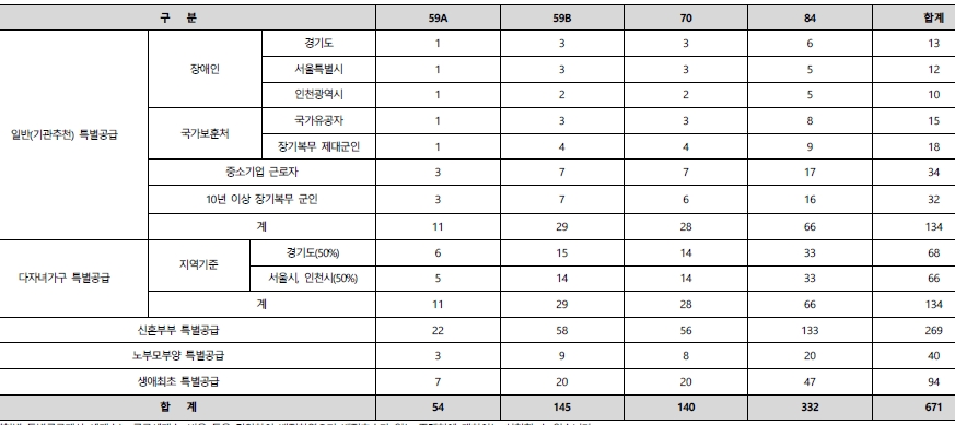- [특별공급 671세대 - 일반(기관추천)특별공급 134세대, 다자녀가구특별공급 134세대, 신혼부부특별공급 269세대,
