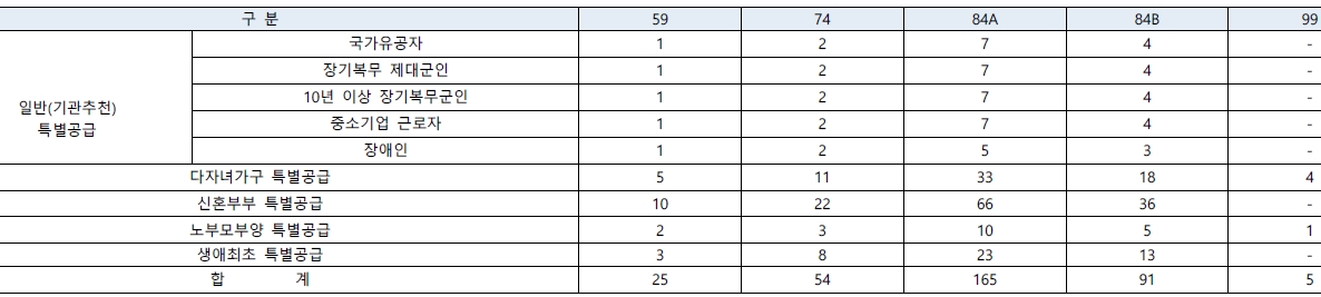 [특별공급 340세대(일반[기관추천]특별공급 67세대, 다자녀가구특별공급 71세대, 신혼부부특별공급 134세대, 노부모부양특별공급 21세대, 생애최초특별공급 47세대 포함)] 및 부대복리시설 - 입주시기 : 2023년 12월 예정