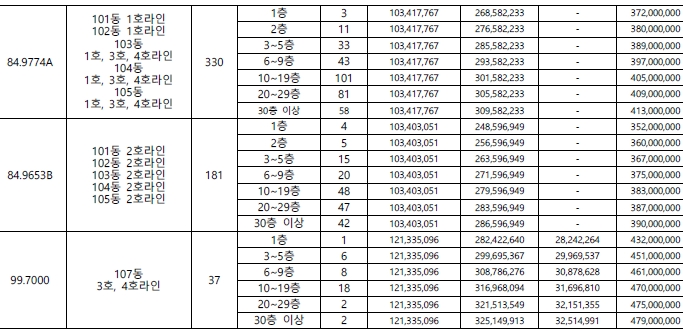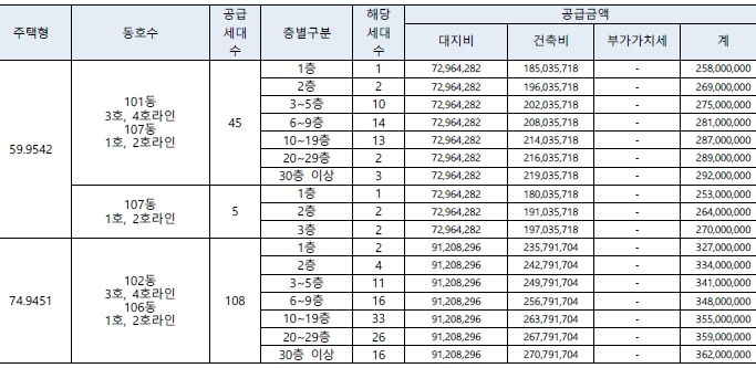 전용면적 별로는 59㎡ 50가구, 74㎡ 108가구, 84㎡A 330가구, 84㎡B 181가구, 99㎡ 37가구로 구성된다.