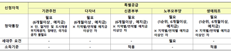 - 최초 입주자모집공고일 현재 다음 특별공급 유형별 무주택세대구성원 또는 무주택세대주 요건을 갖추어야 한다.