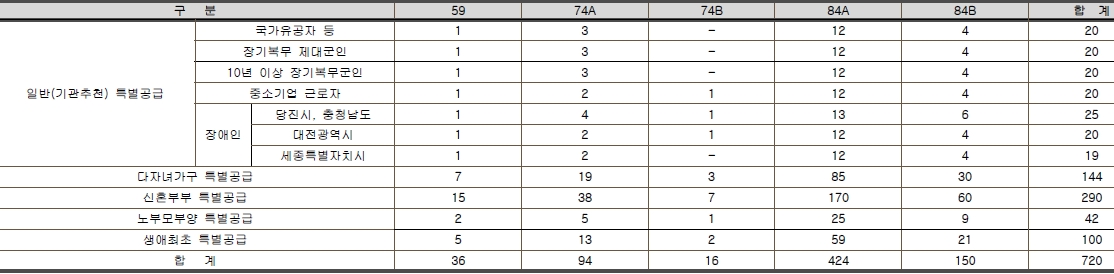 일반공급 740세대, 특별공급 720세대(일반[기관추천] 144세대, 다자녀가구 144세대, 신혼부부 290세대, 노부모부양 42세대, 생애최초 100세대 포함) 및 부대복리시설