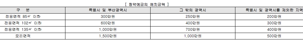 청약예금의 예치금액은 다음과 같다.