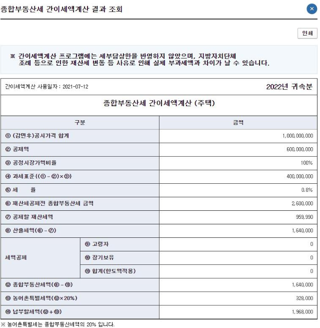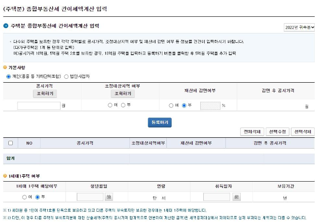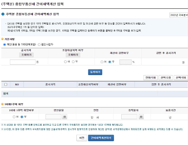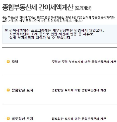 국세청 홈택스 웹페이지 hometax.go.kr의 메인화면에서 세금모의계산을 클릭하여 종합부동산세 간이세액계산을 클릭하면 간편하게 종부세를 모의 계산해볼 수 있다.