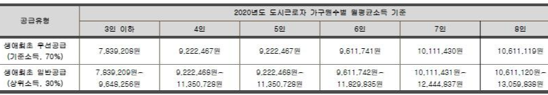 2021.02.25. 이후 신규 입주자모집공고분부터 적용되는 2020년도 도시근로자 가구원수별 가구당 월평균 소득기준이다.