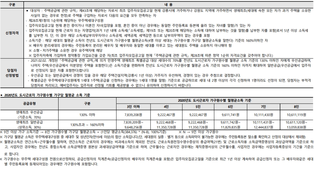 ▪ 대상자 : 「주택공급에 관한 규칙」 제40조에 해당하는 자로서 최초 입주자모집공고일 현재 강릉시 또는 강원도 지역에 거주하는 만19세 미만의 자녀 3명(태아 포함) 이상을 둔 현재 무주택세대구성원