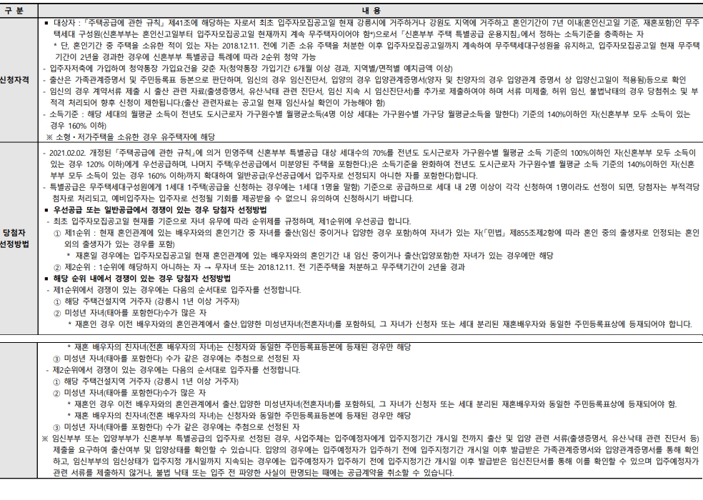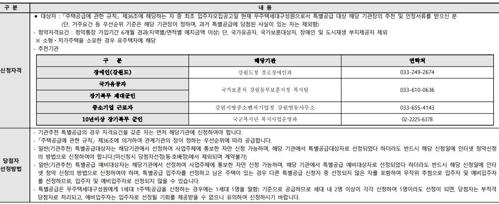 - 특별공급은 무주택세대구성원에게 1세대 1주택(공급을 신청하는 경우에는 1세대 1명을 말함) 기준으로 공급하므로 세대 내 2명 이상이 각각 신청하여 1명이라도 선정이 되면, 당첨자는 부적격 당첨자로 처리되고, 예비입주자는 입주자로 선정될 기회를 제공받을 수 없으니 유의하여 신청하시기 바랍니다.