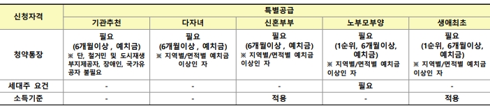 특별공급 공통사항은 1회한정/자격요건과 자격제한, 무주택요건, 청약자격 요건을 필요로하며 자세한 사항은 다음에서 확인할 수 있다.