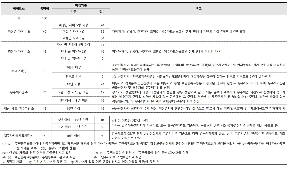 - 자녀수에는 태아나 입양자녀도 포함됨. (단, 태아나 입양한 자녀를 자녀수에 포함할 경우 출산 등과 관련한 자료를 제출하거나 입주시까지 입양이 유지되어야 함(「주택공급에 관한 규칙」 제40조제3항))
