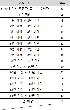 무주택기간 가점 산정기준표는 하단에 기술되어있다.