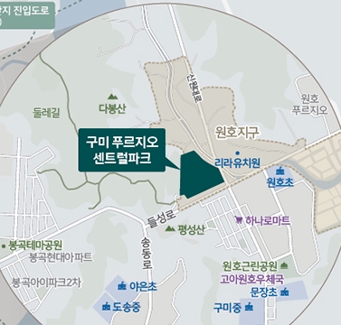 구미 푸르지오 센트럴파크 아파트가 들어서는 원호지구 도시개발사업지구는 약 24㎡ 규모로 2천795명의 약 1천75세대를 수용할 수 있다.