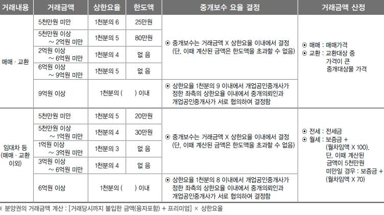 매매·교환·임대차 등 1천분의 ( ) 이내가 상한요율이며 보수 요율 결정 및 거래금액 산정은 상한요율 1천분의 9 이내에서 개업공인중개사가 정한 좌측의 상한요율 이내에서 중개의뢰인과 개업공인중개사가 서로 협의하여 결정한다.