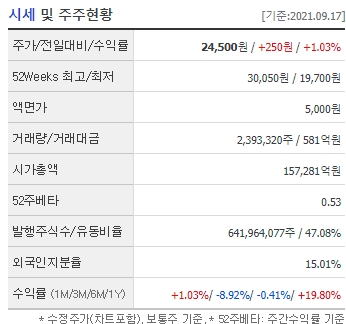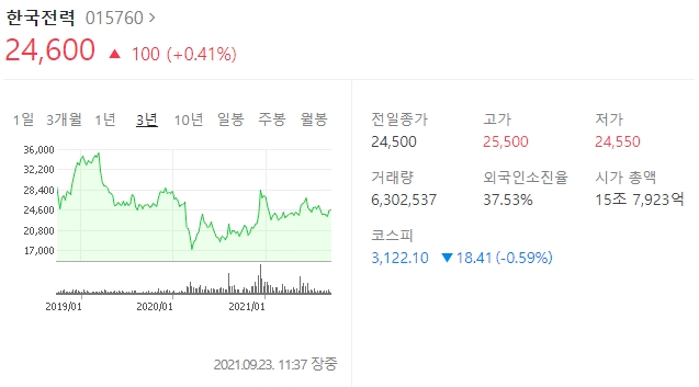 이번에 한전의 전기요금 인상으로 2021년 9월 23일 추석연휴 끝난 후 첫 주가는 2만4천650원에 거래되었다.