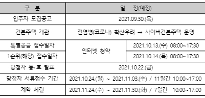 ※ 「리더스시티」는 「천동3지구 4BL 민간참여 공공주택사업」으로 사업협약서에 의거 분양 및 분양관리 업무를 계룡건설산업(주)에서 주관함 - 특별공급 규모 및 내역 : 특별공급 552세대 중 기관추천 특별공급 65세대