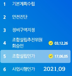 조합설립추진위원회승인은 2003년12월 26일이며 조합설립인가는 2017년 06월 5일 인가를 받았다.