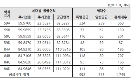 전용면적 공급 가구수는 59㎡A 563가구, 59㎡B 139가구, 59㎡C 201가구, 59㎡D 87가구, 84㎡A 185가구, 84㎡B 207가구, 84㎡C 166가구, 84㎡D 197가구이다.