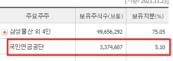 삼성바이오로직스 보유지분은 국민연금공단이 5프로를 가지고 있다.